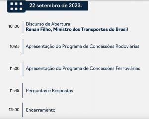En este evento, presentarán las nuevas oportunidades de inversión en concesiones de carreteras y ferrocarriles, en un contexto donde Brasil planea invertir R$ 280 mil millones (€53 mil millones) en infraestructura de transporte. Además presentarán la nueva política, el programa y el portafolio de proyectos de concesiones del Ministerio de Transporte. Será una oportunidad única para explorar las posibilidades de inversión en concesiones de carreteras y ferrocarriles en Brasil y para participar en diálogos constructivos entre los sectores público y privado.